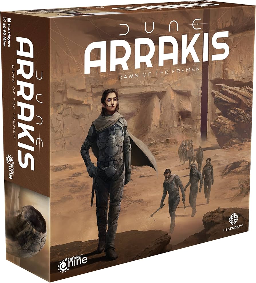 Arrakis: Dawn of the Fremen is a board game for 2–4 players, ages 14+, that is set centuries before the Dune novels, focusing on the brutal tribal struggles for control of the planet Arrakis. Players lead Fremen tribes to gather resources, develop weapons and sietches, and harness the power of sandworms. Gameplay is divided into three parts: “Harj,” a setup phase for positioning; the “Initiation Cycle,” an introductory round; and “Cycles,” the main game rounds where players compete to control the most sietches to win.