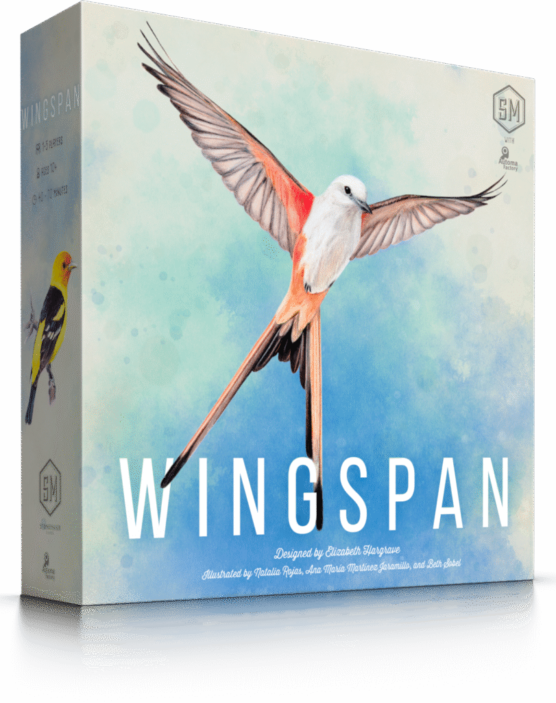Wingspan is a competitive, medium-weight, card-driven, engine-building board game from Stonemaier Games. It’s designed by Elizabeth Hargrave and features 180 birds illustrated by Natalia Rojas and Ana Maria Martinez.