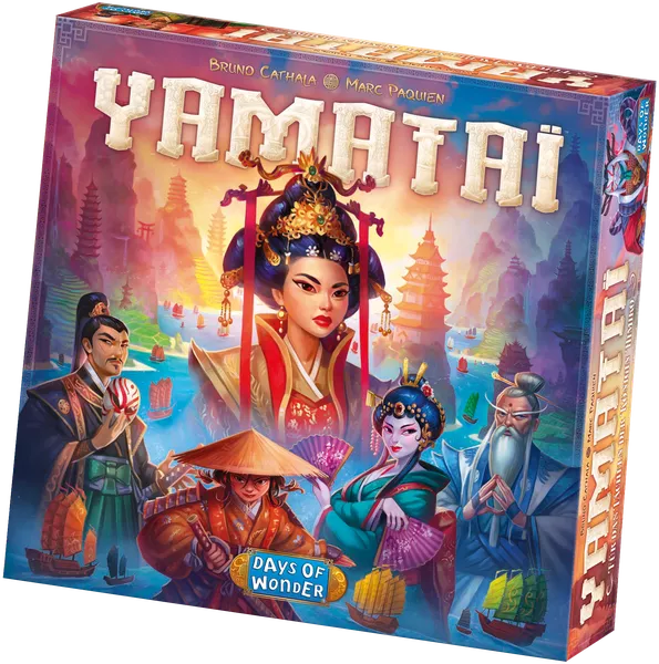 In Yamatai, 2-4 players compete to build palaces, torii, and their own buildings in the land of Yamatai. The game includes ten numbered action tiles, each showing one or more colored ships and with most showing a special action. You shuffle these tiles, place them in a row, then reveal one more than the number of players.